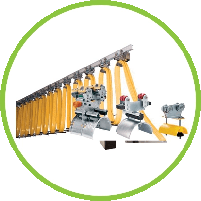 Estos sistemas proporcionan energía eléctrica a equipos móviles, como grúas y polipastos eléctricos, a medida que se desplazan a lo largo de una pista o carril electrificado. Facilitan el movimiento seguro y continuo de cargas pesadas.